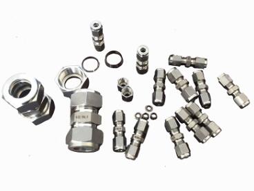 卡套式管接頭由三部分組成:接頭體、卡套、螺母。當卡套和螺母套在鋼管上刺進接頭體后,旋緊螺母時,卡套前端外側(cè)與接頭體錐面貼合,內(nèi)刃均勻地咬入無縫鋼管,構(gòu)成有用密封。